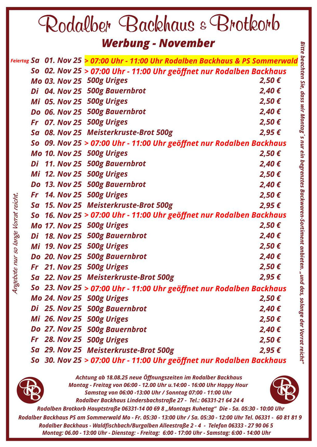 Unsere Öffnungszeiten im Brotkorb ab 01.12.24